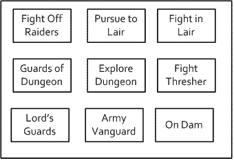 The trick of this is that you are basically discarding existing framing mechanisms (dungeons, overland maps and encounter tables) and replacing it with something more obviously structural, tying the scenes together much the same way they might be tied together in a movie or TV show. Practically, this is pretty easy to implement. Let’s say I want to do a 9 fight heroic campaign; that’s 3 rows of 3. In term sof a narrative I want the heroes to face a local danger, be imperiled revealing the greater danger, then face the real danger. That’s 3 acts/rows right there.