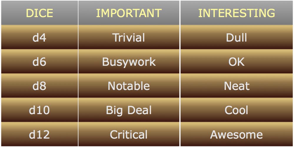Anyway, this is hardly applicable to every game, but on the off chance it tickles your fancy, I use the table below.
