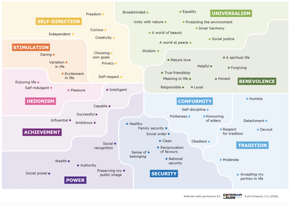 Caveat before all of this begins – the material I’m about to use is sourced from a psychology paper on values which were used as the source for the diagram in a Common Cause article. I lack the expertise to speak on its value as psychology, and am really just looking at it through the lens of narrative and games.